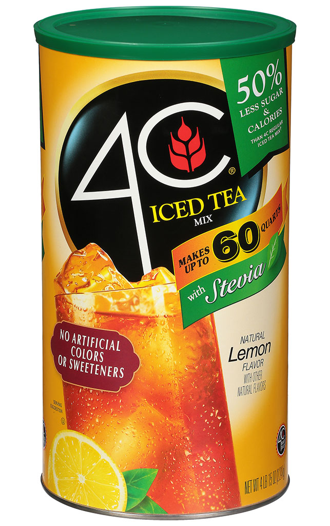 Are you looking to cut your sugar intake? Look no further. 4C now offers you Reduced Sugar Iced Tea mix, with 50% less sugar than our sugar based iced teas. Sweetened with Stevia, a natural plant-based sweetener as well as Cane Sugar, 4C Reduced Sugar Iced Tea has 50% less sugar than our sugar-based offerings, with only 50 calories per serving. Delicious natural lemon-flavored iced tea, sure to quench any thirst. Makes up to 28 quarts, is packed in an easy-to-open canister with a measuring scoop to make life easy!